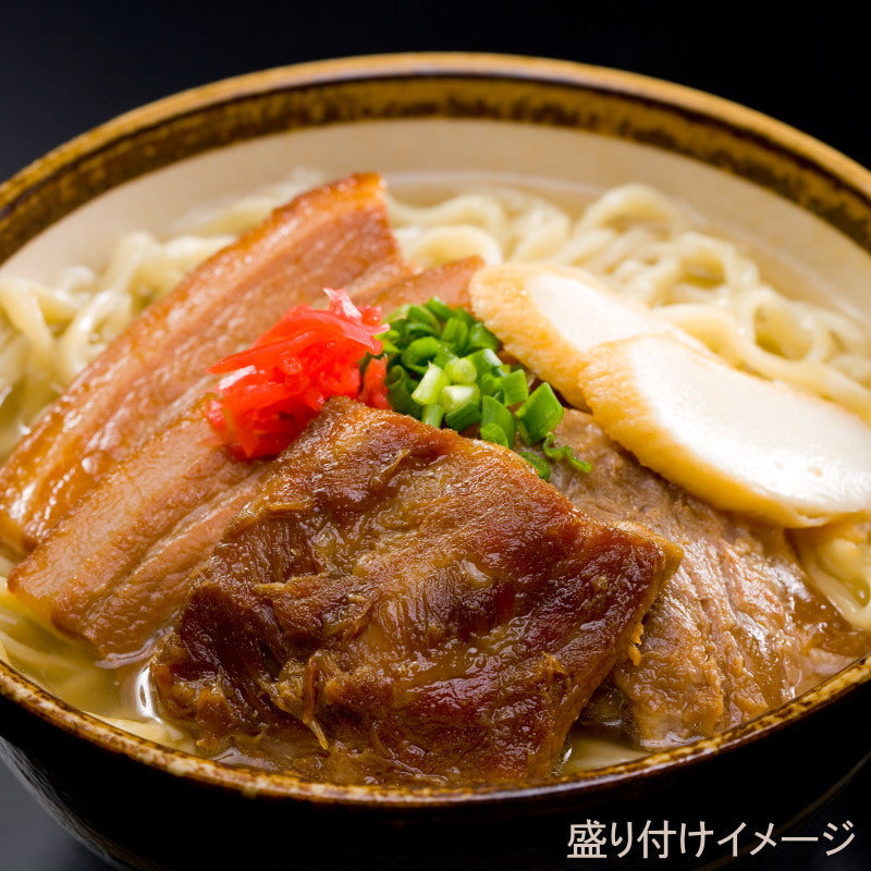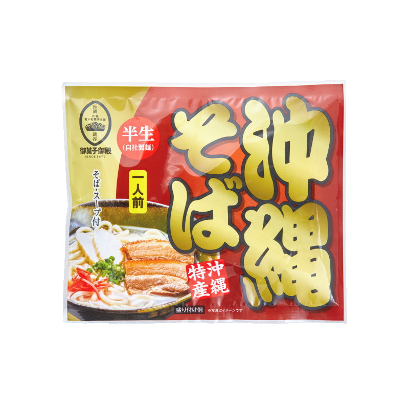御菓子御殿オリジナルの沖縄そば。自社工場でこしのある自家製麺に仕上げました。ソーキやらふてぃをトッピングしてお召し上がりください。